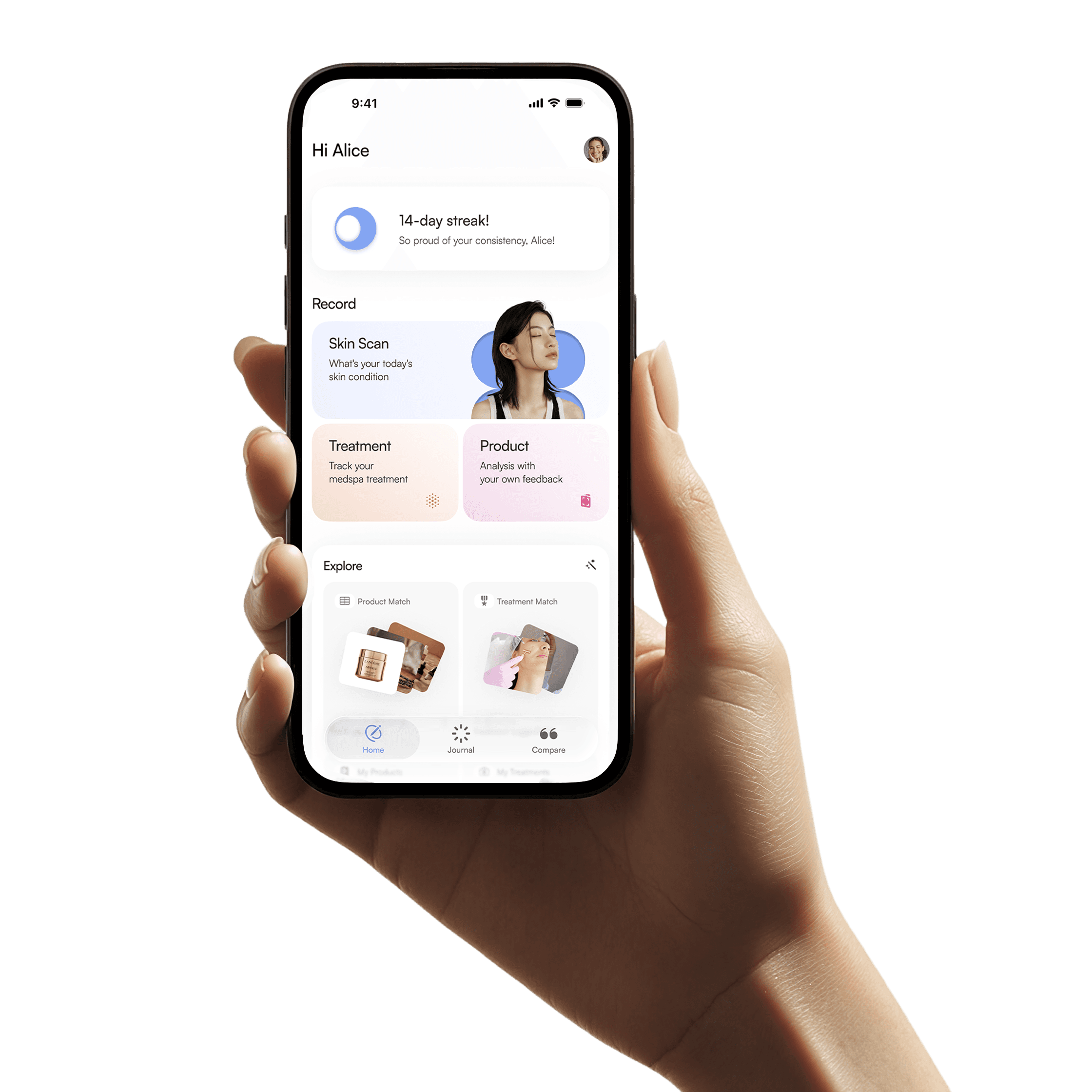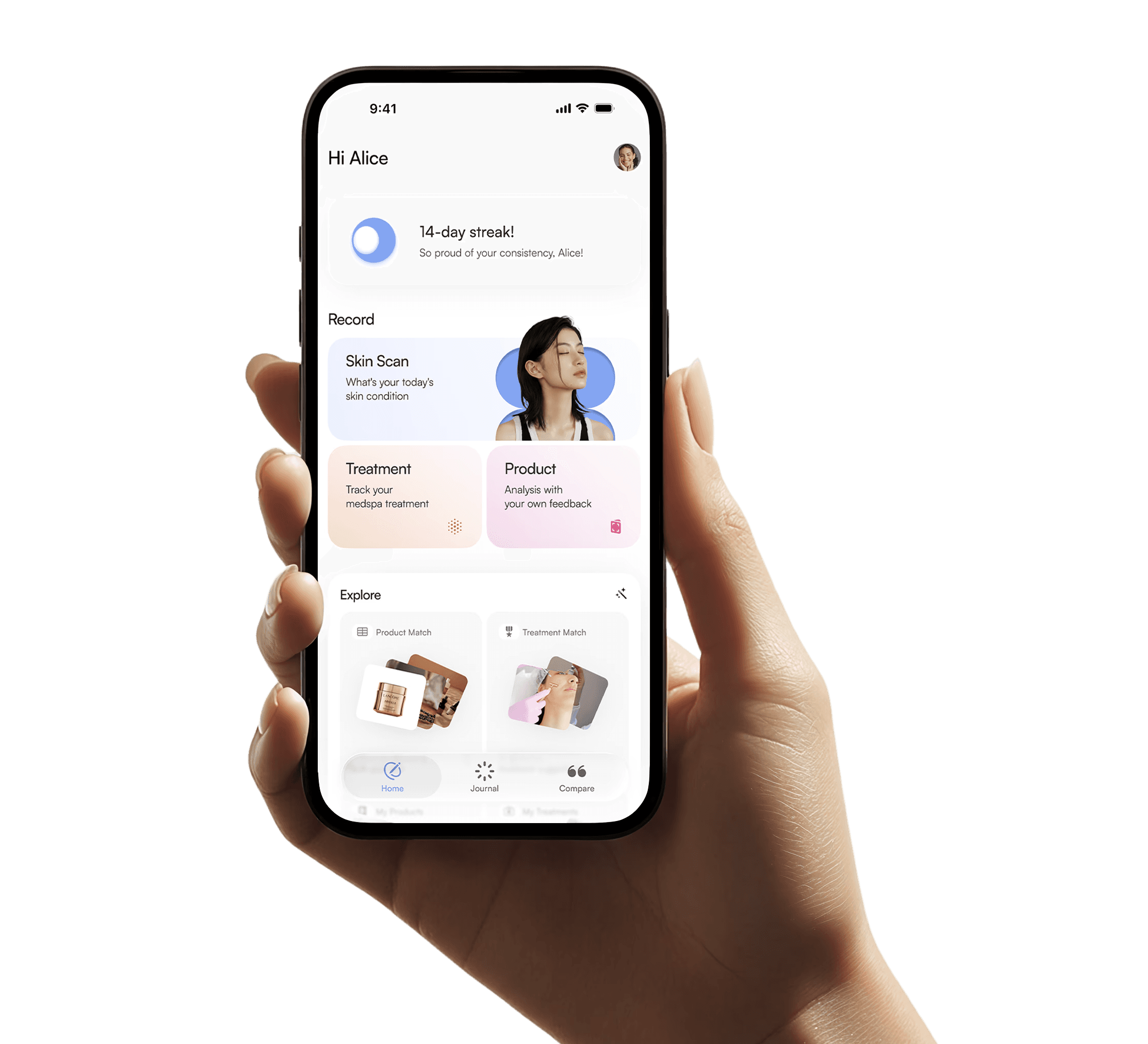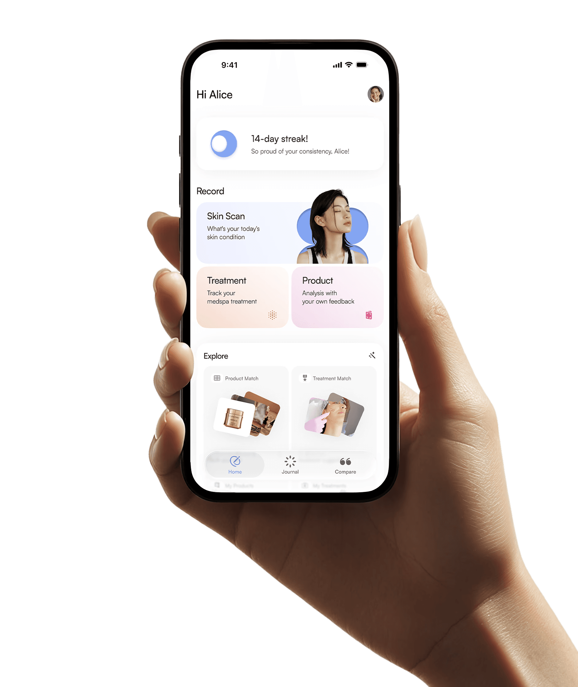 A user-centric design that makes daily logging and tracking your skin effortless without distraction.